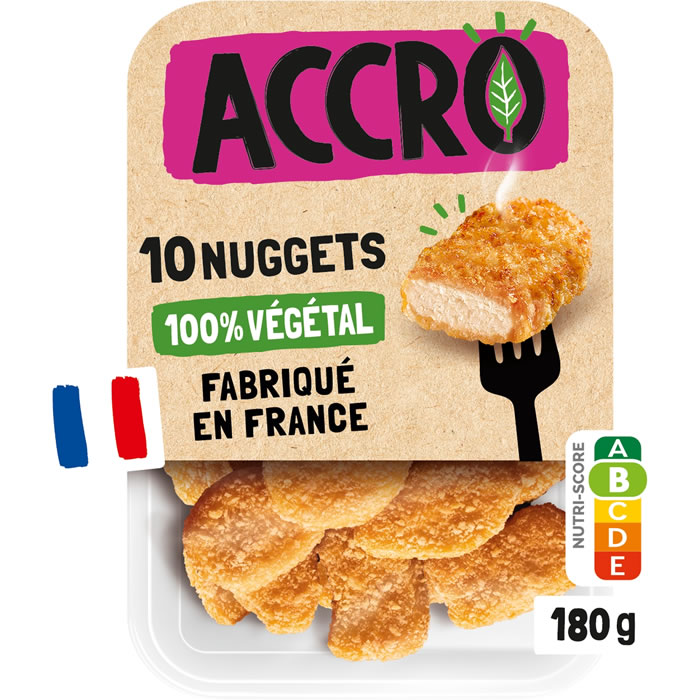 Nuggets végétaux ACCRO. 180g, 100% végétal, protéines de pois et blé, Nutriscore B, fabriqué en France.
