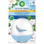 Diffuseur électrique Air Wick fleur de coton & orchidée. Parfum floral doux, neutralise les odeurs. Intensité modulable (5 niveaux), bouton d’amplification.