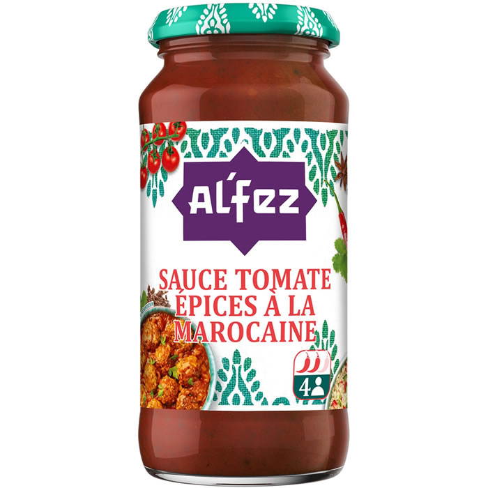 Al’Fez Sauce tomate aux épices marocaines Découvrez la gourmandise de la sauce tomate aux épices marocaines, une sauce tomate aux oignons, aux épices douces et aux herbes aromatiques. Les sauces prêtes-à-l’emploi Al’Fez permettent de réaliser facilement un savoureux tajine, et peuvent également remplacer les sauces tomate dans tous les plats du quotidien. Sans arômes, ni colorants, ni conservateurs artificiels, elles apportent une touche d’exotisme sans être trop épicées, pour s’adresser à toute la famille.