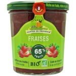 Confiture Extra de Fraises allégée en sucres, 30% de sucres en moins qu’une confiture traditionnelle. Préparée avec 50 g de fruits pour 100 g de produit fini. Format 350g.
