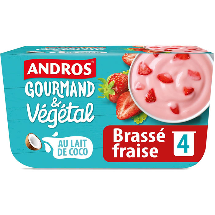 Andros Gourmand & Végétal dessert brassé fraise au lait de coco. 100% végétal avec lait de coco allégé 50% et fraise 13,8% avec morceaux. Faible en matières grasses, source de calcium. Sans lactose. Spécialité végétale fermentée. Nutriscore C. 4 pots de 100g.