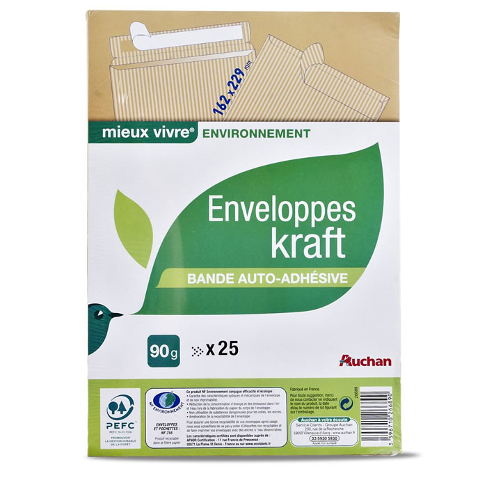 AUCHAN Mieux Vivre – Enveloppes auto-adhésives 162 x 229 mm (25 enveloppes)