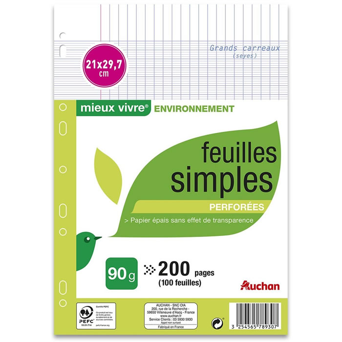 Désignation légale : AUCHAN Mieux vivre Feuilles simples 21 x 29,7 cm