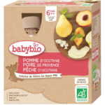 Purée bio mariant pommes de Nouvelle-Aquitaine et jus de clémentines de Corse IGP, avec riz de Camargue IGP. Texture lisse, recette adaptée à l’alimentation infantile.