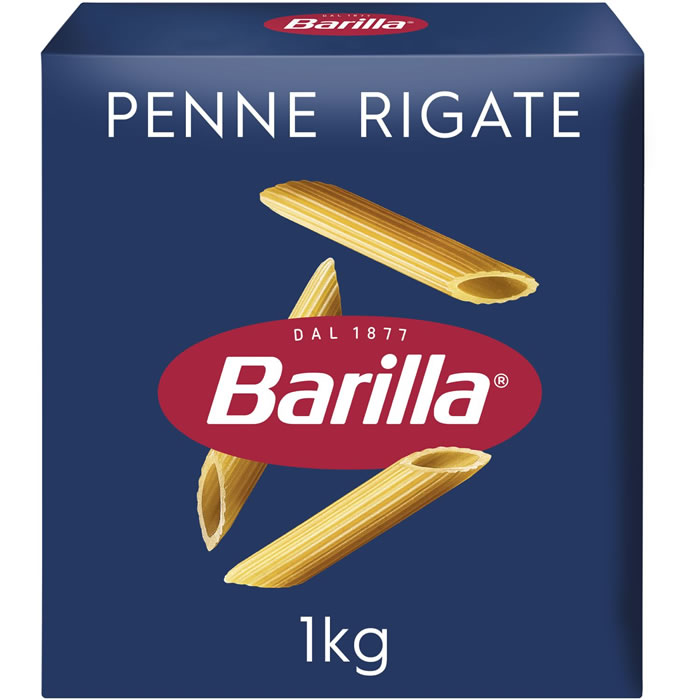 Penne rigate N°73 BARILLA : pâtes courtes italiennes, al dente, format familial 1kg, idéales pour recettes gourmandes. Depuis 1877.