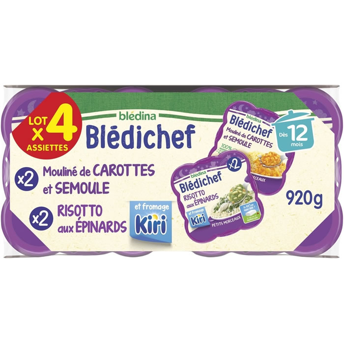 Format : 4 x 230 g (2 Moulinés carottes-semoule + 2 Risottos épinards au fromage Kiri)