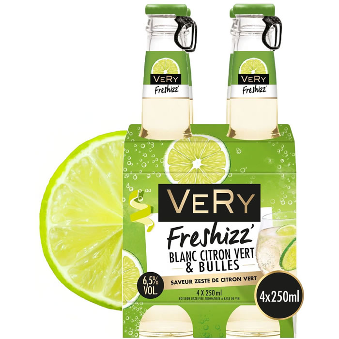 Boisson pétillante à base de vin blanc et citron vert VERY Freshizz’ 4 x 25 cl, 6,5% vol. Marque VERY Freshizz’, EAN 3211200322312.