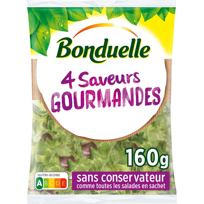 Salade composée 4 saveurs gourmandes — 160 g, mélange de frisée, mâche, chicorée rouge et roquette. Origine : FRANCE. Nutri‑score : A.