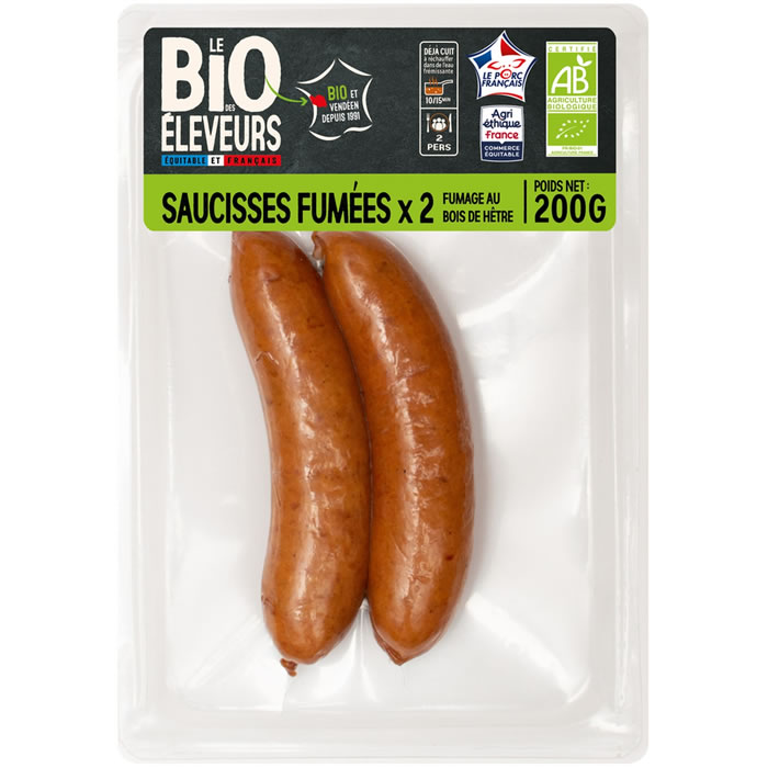Saucisses fumées au bois de hêtre, 100% bio et sans nitrite. Goût délicat et équilibré. Nutri-Score Niveau D.