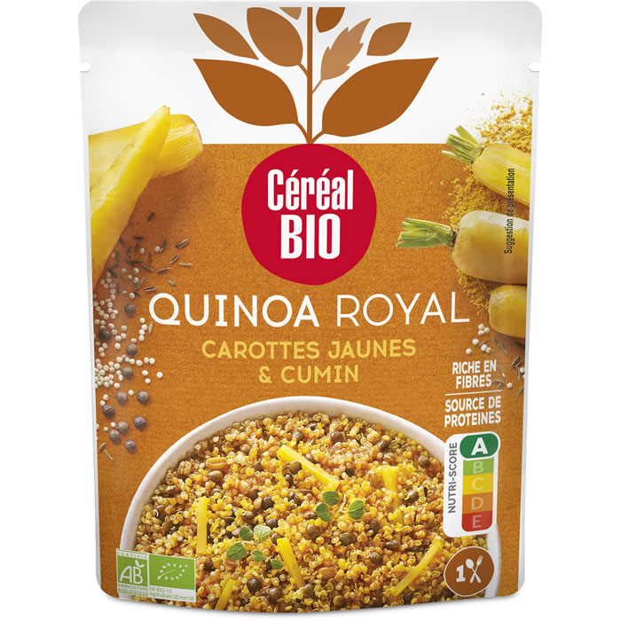 CEREAL BIO quinoa, carottes et cumin micro-ondes bio. Plat végétal délicieux associant soja, céréales et légumes. Source de protéines et fibres. Prêt en 2 minutes.