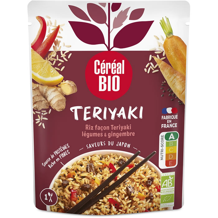 Riz façon teriyaki bio, céréales gourmandes, soja, légumes. Prêt en 2 minutes, accompagnement créatif.