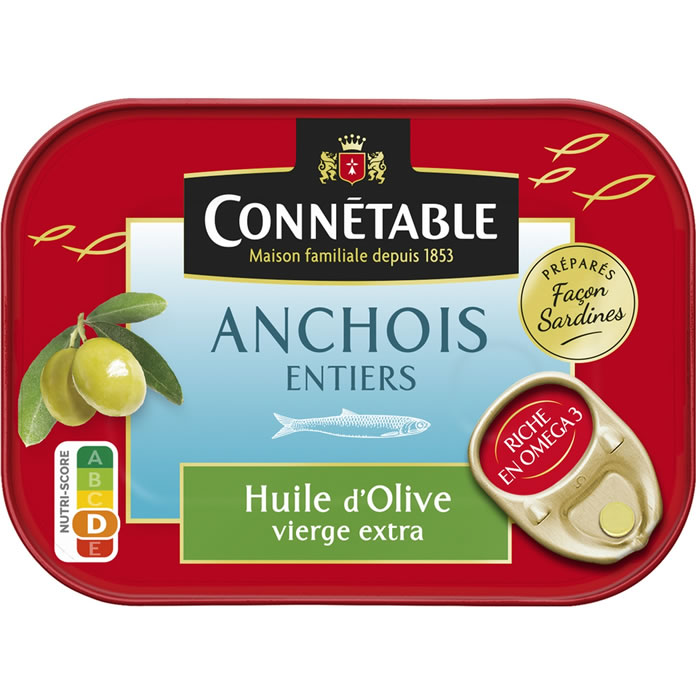 Anchois entiers CONNETABLE, 100 g, Nutri-Score D, origine Maroc.