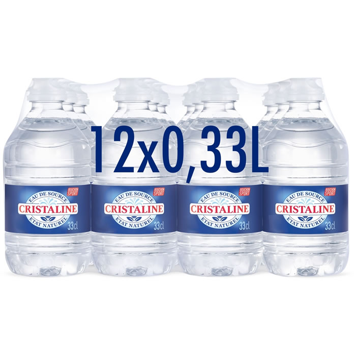 L’eau de source Cristaline, l’eau préférée des Français, dans un format pratique de 12x33cl avec un bouchon sport pour une hydratation facile à tout moment.