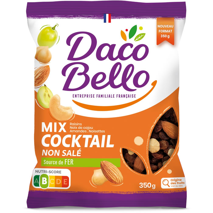 Mix Cocktail DACO BELLO — 350 g, raisins, noix de cajou, amandes et noisettes. Nutri‑score : C. Origine : FRANCE.