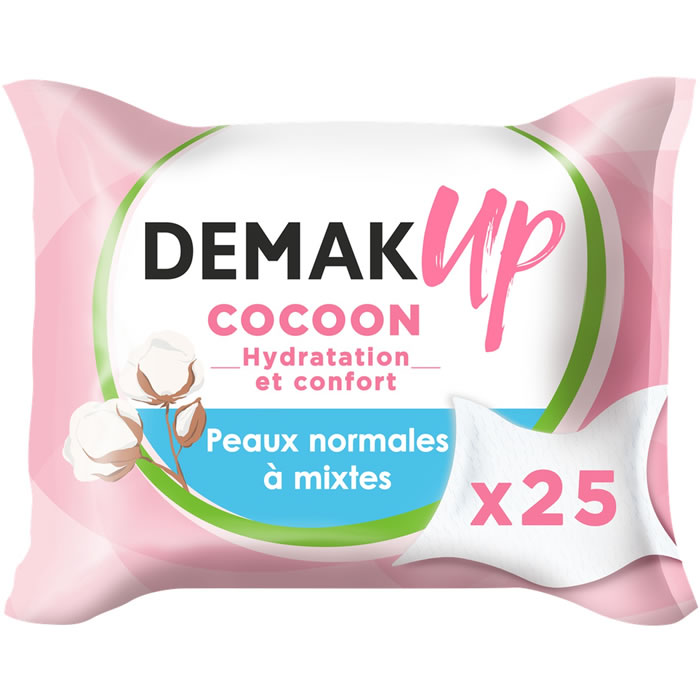 Lingettes démaquillantes DEMAK’UP Cocoon, imprégnées d’un lait démaquillant hydratant aux extraits d’amande de coton, propriétés adoucissantes et émollientes, agréable sensation de confort, pour visage et yeux, 25 lingettes.