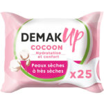 Lingettes démaquillantes DEMAK’UP Cocoon au lait hydratant, enrichies en lait hydratant, nettoient en douceur le visage et les yeux, pratiques et efficaces, sensation de confort et d’hydratation, parfaites pour un démaquillage rapide et respectueux de la peau, pack de 75 lingettes (3×25).