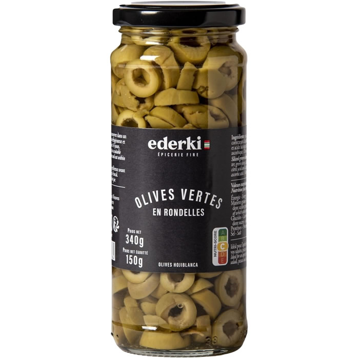 Olives vertes en rondelles EDERKI, fermes et savoureuses, parfaites à l’apéritif ou dans vos préparations culinaires.