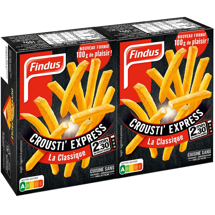 Frites micro-ondables Findus : prêtes en 2 min 30, dorées et croustillantes, idéales pour un snack rapide.