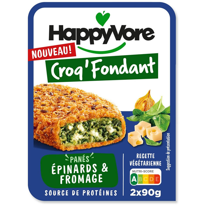 Panés d’épinard et fromage HAPPYVORE Croq’Fondant. 2x90g, pané veggie, épinards, fromage, source de protéines, Nutriscore A.