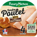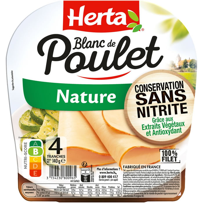 Blanc de poulet sans nitrite, texture tendre et goût délicat. Conservation naturelle aux extraits végétaux. Idéal pour sandwichs et salades au quotidien. Nutri‑Score Niveau B.