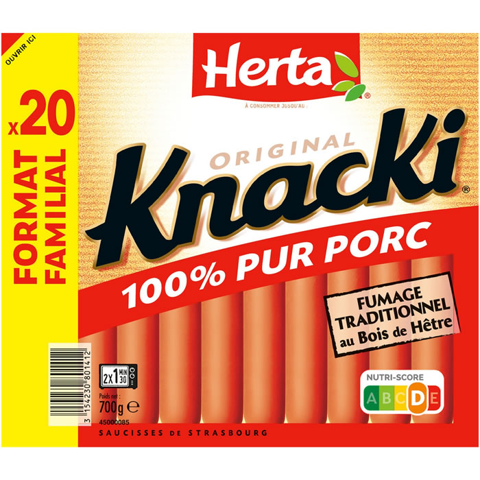 Saucisses de Strasbourg HERTA Knacki. 700g, 20 pièces, pur porc, goût fumé, Nutriscore D.