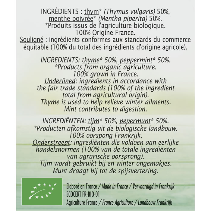 Ingrédients : Thym* (Thymus vulgaris) 50%, menthe poivrée* (Mentha piperita) 50%. *Produits issus de l’agriculture biologique. 100% origine France. 50% du total des ingrédients d’origine agricole est conforme aux standards du commerce équitable (menthe poivrée).