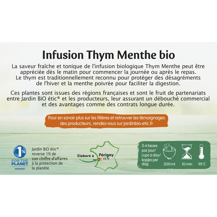 Infusion thym menthe bio JARDIN BIO Étic, 30g, 20 sachets, France.