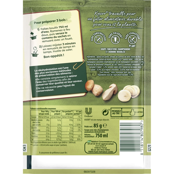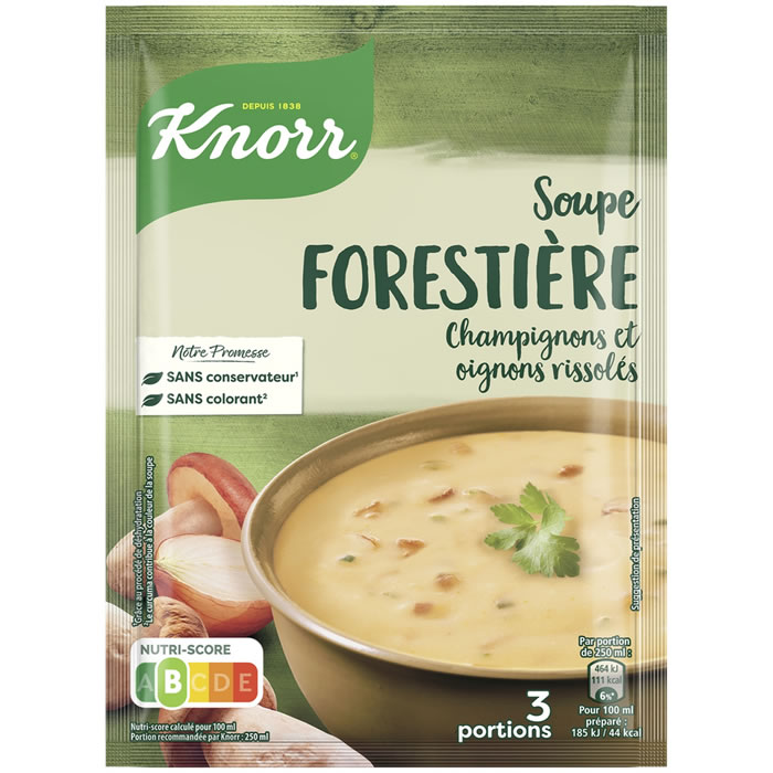 Soupe forestière instantanée aux champignons et oignons KNORR. Format 85g, 3 portions. Recette forestière, Nutriscore D.