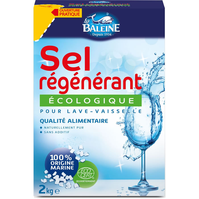 La Baleine Sel régénérant écologique: 100% sel de mer, certifié Ecocert, protège contre le calcaire et améliore le lavage. Étui 2 kg, origine France.