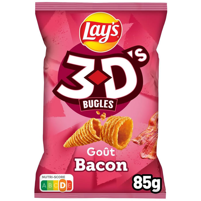 LAY’S 3D’s biscuits soufflés saveur bacon. 85g de biscuits soufflés au goût intense de bacon fumé avec une texture 3D originale. Une recette de qualité pour encore plus de plaisir.