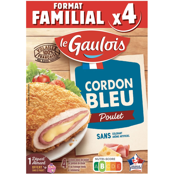 Découvrez les Cordons Bleus de poulet Le Gaulois ! Sous une chapelure croustillante, découvrez une viande de poulet associée à du fromage fondu et une tranche de jambon de dinde. Composés de 47% de viande de filets de poulet et d’une composition équilibrée avec fromage et jambon de dinde, ces cordons bleus offrent un format familial de 4 pièces pour des repas rapides et délicieux. Prêts en 12 minutes au four, ils sont les complices des mamans !