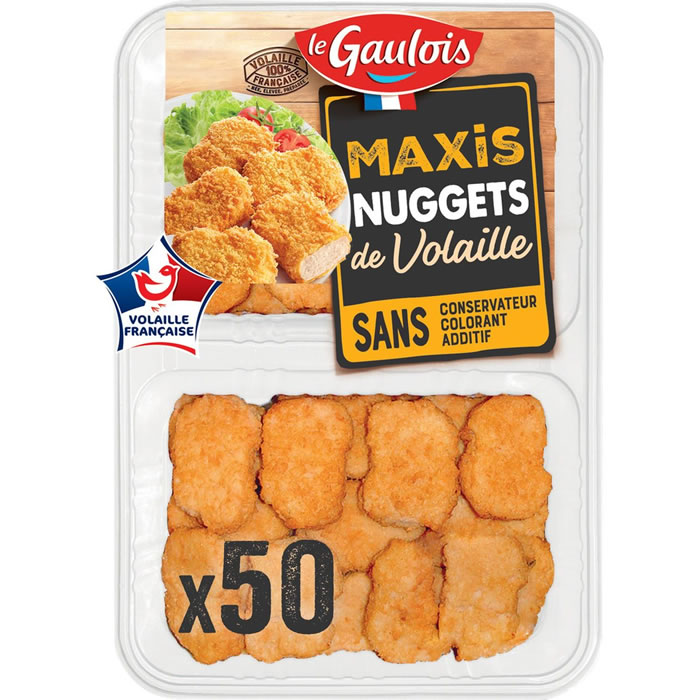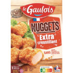 Nuggets Le Gaulois format familial. 50 pièces de 1kg avec 68% de viande de dinde française. Label Volaille Française, à consommer sous 3 jours.
