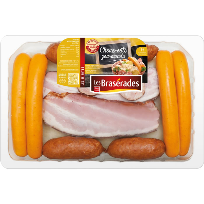Ingrédients : Choucroute au Riesling 1000g (choucroute 80%, bouillon (jus de cuisson, saindoux, Riesling origine Alsace 2%, arôme naturel), sel, antioxydant : E300), saucisses de Francfort 260g (viande et gras de porc* 72%, eau, stabilisant : E451, sel, plasma de porc, dextrose, acidifiant : E575, arômes naturels, exhausteur de goût : E621, épices, antioxydant : E316, plante aromatique, poireau, conservateur : E250, E326, E262, coriandre, gingembre, muscade, poivre blanc, paprika, piment de Jamaïque, arômes naturels, boyau naturel de mouton), saucisses fumées 200g (viande et gras de porc* 90%, eau, sel, sirop de glucose, dextrose, épices, plantes aromatiques, antioxydants : E300, E301, arômes naturels, colorant : rouge de betterave, conservateur : E250, stabilisants : E450, E451, boyau naturel de porc), poitrine de porc fumée 180g (poitrine de porc* 80%, eau, sel, conservateurs : E326, E262, E250, sirop de glucose, antioxydant : E301, arômes naturels, stabilisants : E450, E451). Traces éventuelles de lait, fruits à coque, gluten, moutarde et oeuf. *origine : UE