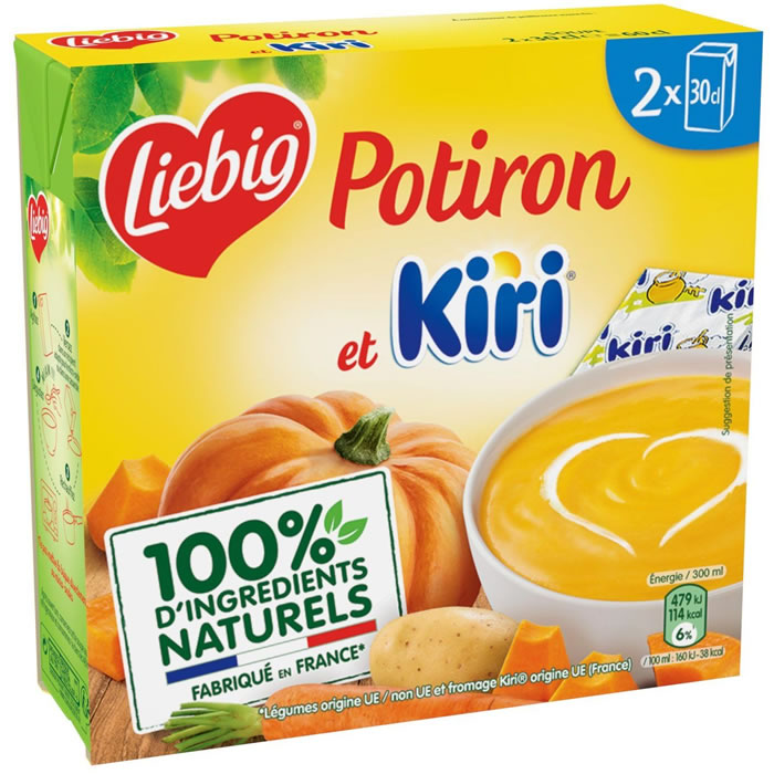 Soupe de potiron et fromage blanc Kiri Liebig. Légumes français 39%, potiron 13%, fromage blanc Kiri 3,1%, 100% naturel, sans conservateur, 2x30cl, Nutriscore B.