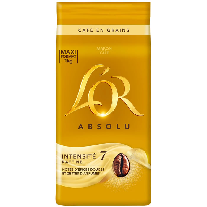 Café en grain raffiné arabica N°7 L’OR Absolu, grand format 1kg, origine Espagne, notes d’épices et agrumes, Rainforest Alliance, Nutriscore B.