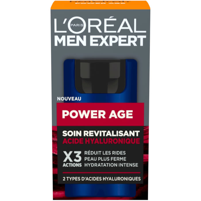 Soin revitalisant visage homme L’OREAL Men Expert à l’acide hyaluronique, triple actions contre les signes de l’âge, rides réduites, peau hydratée et raffermie, calme le feu du rasoir, adapté à tous types de peaux.