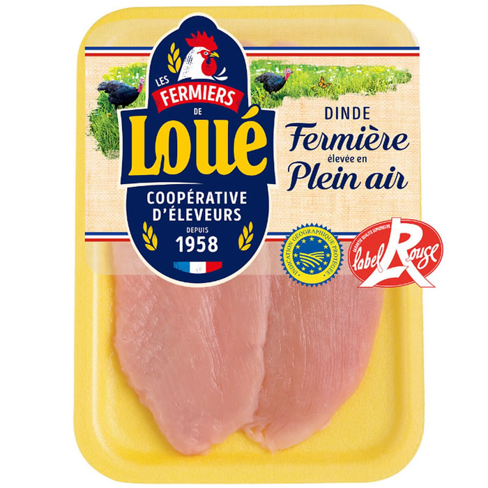 Escalopes de dinde fermière LOUE; 240 g (2 pièces); Label Rouge; IGP Volailles du Maine; origine France; à poêler 4 min; conditionné sous atmosphère protectrice.