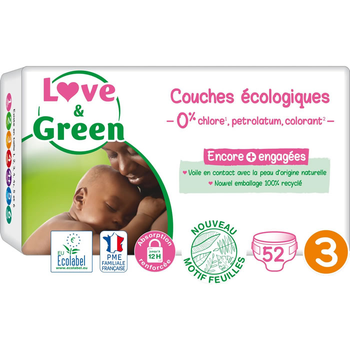 Couches écologiques LOVE & GREEN taille 3 pour bébés de 4 à 9 kg, ultra absorbantes avec 12h de protection, sans ingrédient indésirable, certifiées Ecolabel, cruelty-free, vegan et Dermatest.