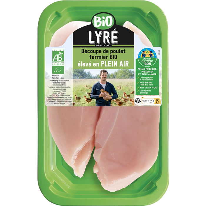 Escalopes de poulet fermier bio LYRE; 200 g (2 pièces); agriculture biologique; label bio européen; origine France; à poêler; ultra frais 0°C à +4°C; promo -40%; à consommer sous 2 jours.