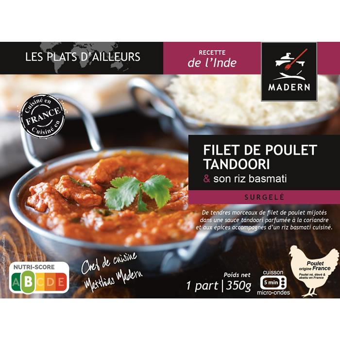 MADERN riz basmati et filet de poulet tandoori micro-ondes. 350g pour 1 personne. Poulet origine France 28,2%, concassée de tomate 9,8%, yaourt 3,9%, épices tandoori authentiques. Nutriscore B.