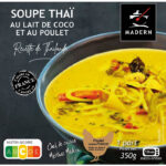 Ingrédients : Semoule (38,7%) (semoule de blé dur, eau), eau, poulet origine France (29,4%) (filet de poulet 23,5% et aiguillette de poulet 5,9%), oignon (11,8%), eau, carotte, abricot (2,4%) (abricots, conservateur : anhydride sulfureux), huile d’olive (1,3%), ail, sucre, beurre (crème de lait, ferments lactiques), amidon transformé de maïs, coulis de tomates, gingembre, miel, sel, cumin, 5 épices, coriandre en feuille, cannelle, curcuma, paprika, amandes effilées, poivre.