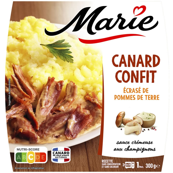 Désignation légale du produit : Canard confit, écrasé de pommes de terre, crème aux cèpes 300g MARIE