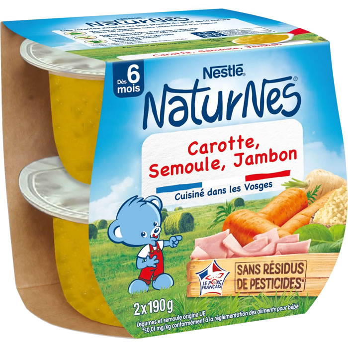 Offrez à votre bébé dès 6 mois le petit pot NaturNes Carotte, Semoule et Jambon de NESTLE. Une recette savoureuse avec des ingrédients naturels et une cuisson vapeur douce, pour un repas gourmand et équilibré. Chaque cuillerée est une invitation à la découverte des saveurs du terroir français.
