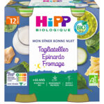 Plat du soir dès 6 mois, carotte, courgette & semoule. Lot 2×200 g. Allergènes : lait, blé. EAN : 7613035832534.