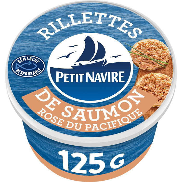 PETIT NAVIRE rillettes de saumon. Délicieuses rillettes à tartiner sur du pain ou à intégrer dans vos recettes. Mélange de saumon rose du Pacifique et thon, parfait pour l’apéritif.