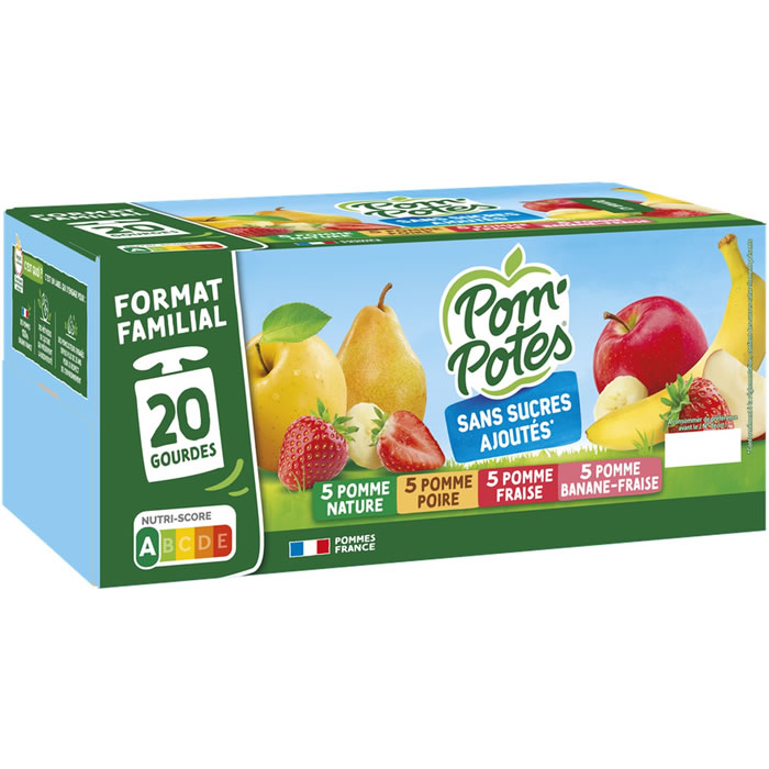 Dessert POM’POTES pomme, fraise, poire, banane sans sucres ajoutés, 20 x 90g, France.