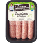 Saucisses de Toulouse façon charcutière, pur porc origine France. Préparation fine avec jambon et hachage gros grain. Savoureuses et authentiques. Nutri‑Score Niveau D.