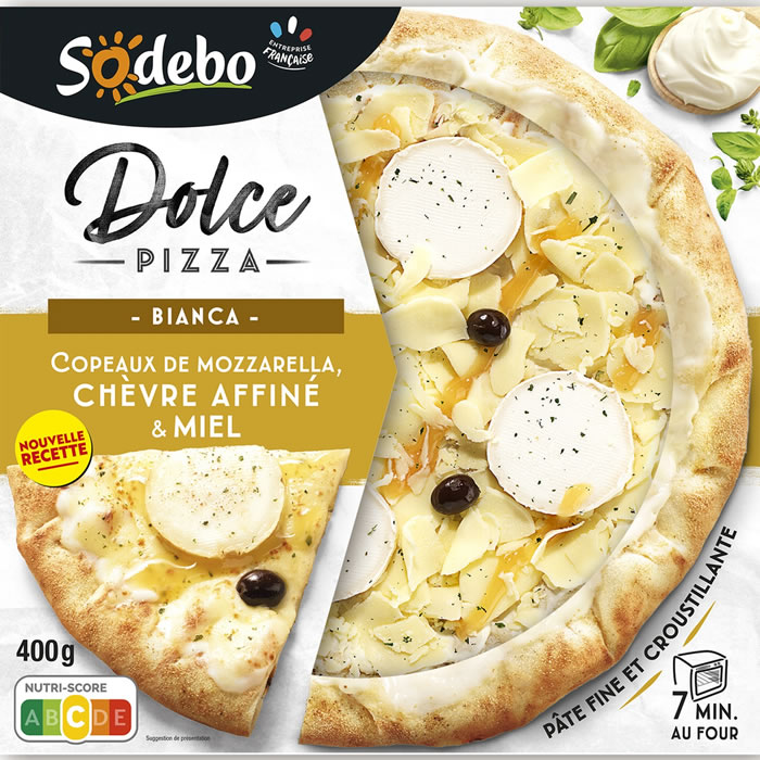 Pizza chèvre et miel Sodebo Dolce, pâte fine garnie de fromage de chèvre affiné, mozzarella, crème légère et miel. 400g pour 1-2 personnes. Origine France.