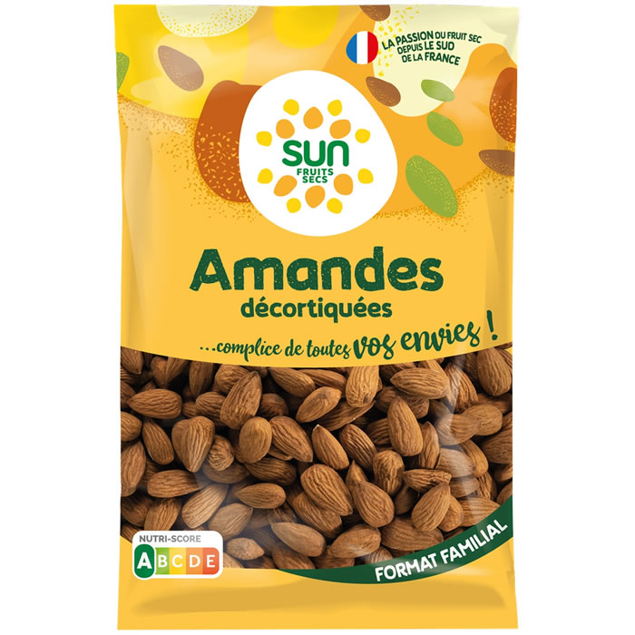Amandes décortiquées SUN — 500 g, amandes entières décortiquées sans sel ajouté. Nutri‑score : A. Origine : ETATS-UNIS.