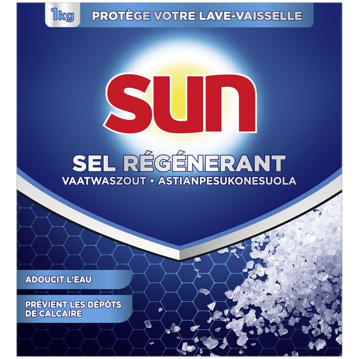 Sun Sel Régénérant: protège contre le calcaire, améliore la performance de lavage et réduit les traces blanches. Emballage 85% recyclé. 1 kg.